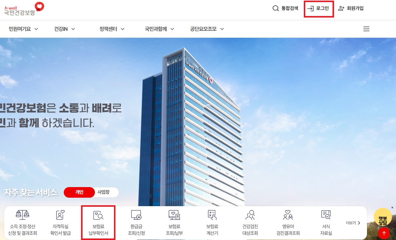 건강보험공단 사이트에 가시면 우측 상단에 있는 로그인을 해주세요.