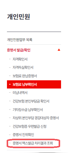 팩스 전송 확인은 좌측 개인민원 메뉴의 증명서 발급 맨 하단에 있는 팩스발급 처리결과조회에서 확인 가능합니다.